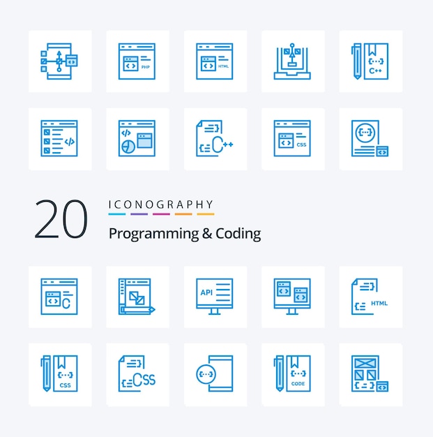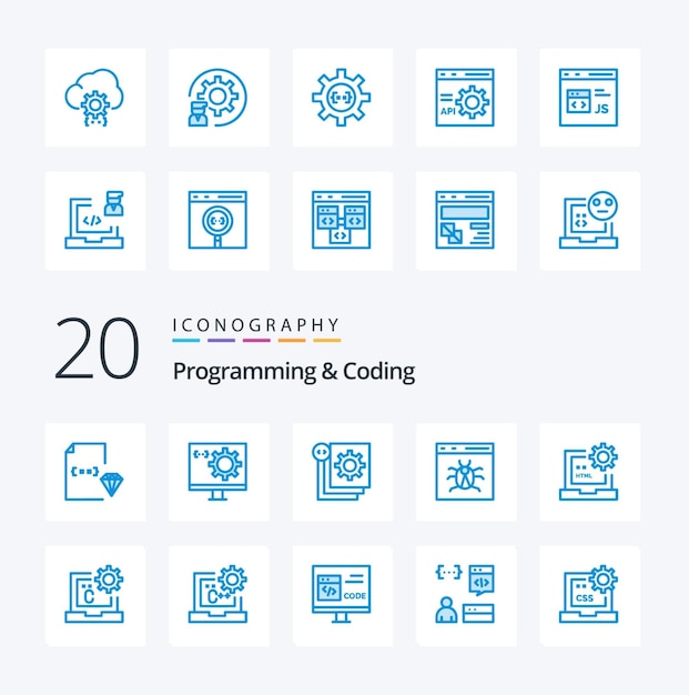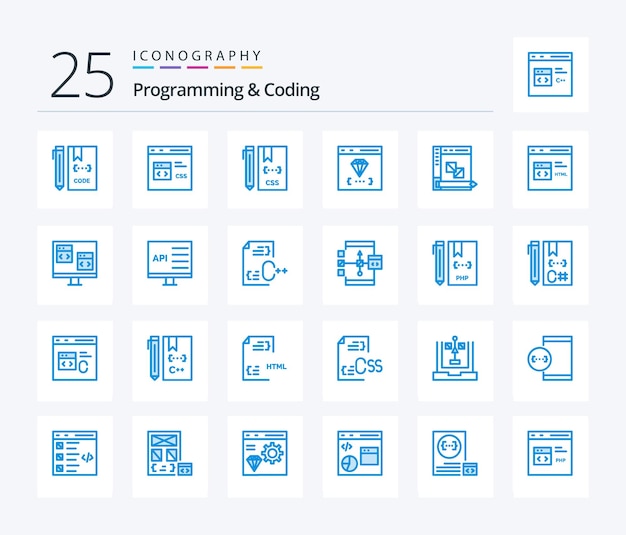 Programmering og koding 25 Blue Color ikonpakke inkludert utvikle nettleser utvikling utvikling datamaskin