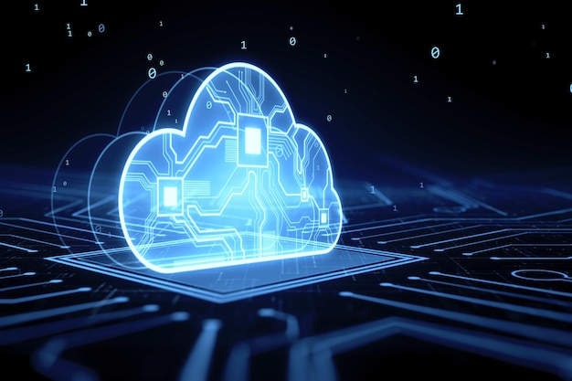 Futuristisk neonfremstilling av skybasert datateknologi med glødende kretser på en mørk overflate som symboliserer datalagring og nettverk