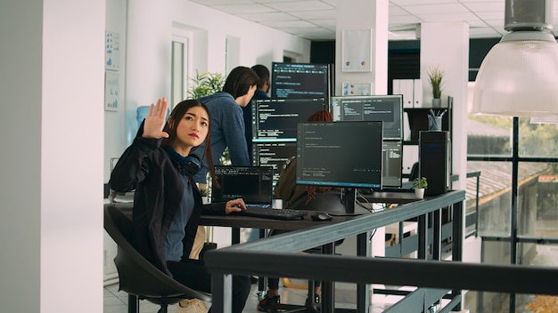 Asian web developer working with hologram and augmented reality to create security system. Using holographic image and new interface for cloud computing, database code programming.