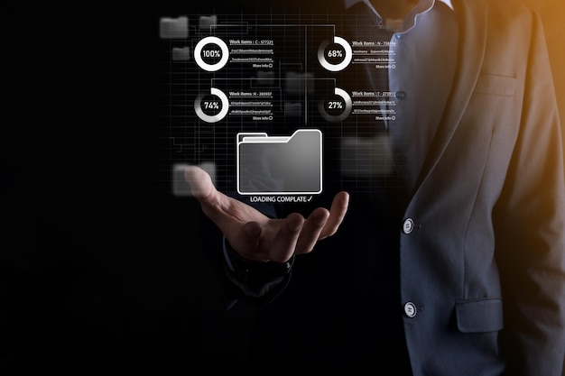 Forretningsutviklerhånd som bruker tavlerammeverk på virtuell moderne datamaskin som viser innovasjon. Agil programvareutvikling, lean prosjektstyringsverktøy for raske endringskonsepter. Dokumenthåndteringssystem DMS