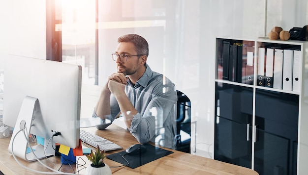 Forretningsmann tenker og planlegger på datamaskinen for informasjonsteknologi eller programmeringsløsning Programmerer eller online utvikler som leser på skrivebordet for problemløsende beslutning eller refleksjon på nettet