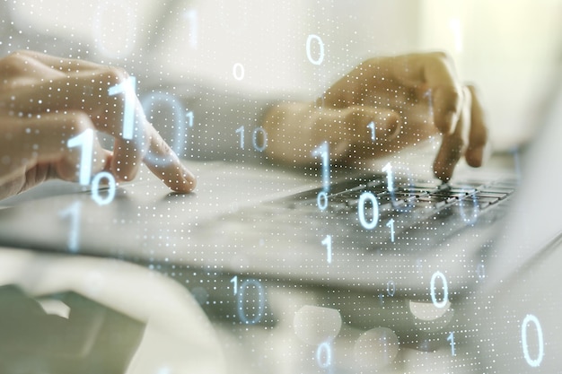Dobbel eksponering av kreativt abstrakt binærkode-hologram og hender som skriver på laptop på bakgrunn. Database- og programmeringskonsept
