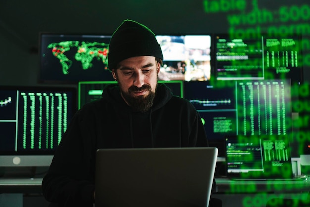 Informatikk hackermann koder et internettvirus for å angripe cybersikkerhetssystemet som skriver med bærbar datamaskin i bakgrunnen mange PC-skjermer med datakode Cybersikkerhetskonsept