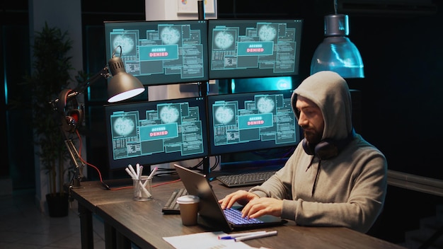 Mannlig hacker tyv som bryter gjennom cybersikkerhetsserver, stjeler data på flere skjermer. Hacker med hette som bruker lydhodesett og forårsaker datamaskin- og system malware med virus. Håndholdt opptak.