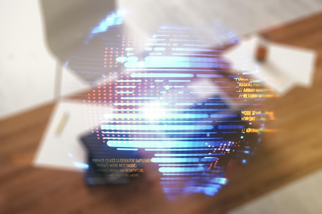 Multieksponering av abstrakt programmeringsspråk-hologram med verdenskart på datamaskinbakgrunn, kunstig intelligens og nevrale nettverk-konsept