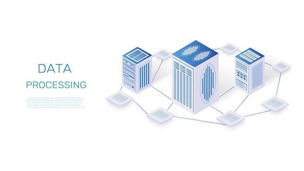 Sky dataserver Hosting nettsted Isometrisk datasenter Informasjonslager infrastruktur Blockchain teknologi Databehandlingssystem Database tilkobling Vektor illustrasjon landing