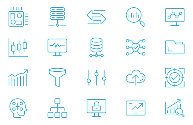 Dataanalyse webikoner sett Pakke med database stordataprosess ai overvåking trafikk hosting tjeneste optimalisering sikkerhetskopiering diagram og annen Vektor omriss strek ikondesign