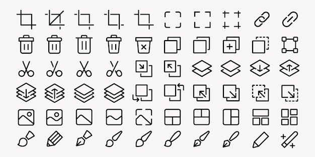 Ikonsett med verktøy som beskjær, slett, lenke og lag. Inkluderer saks, bildeverktøy og designelementer. Perfekt for design- og redigeringsprosjekter. Brukergrensesnittikoner UI-ikonvektorsett