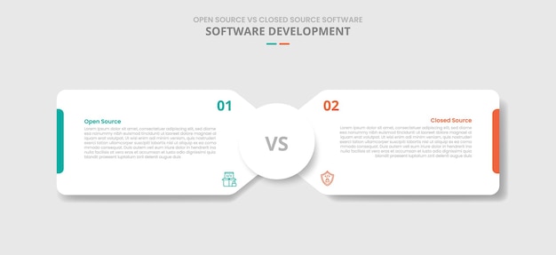 Open source vs closed source programvare sammenligning for infographic med drop shadow stil med rund rektangel stablet lag med sirkel senter tilkobling to punkts liste informasjon